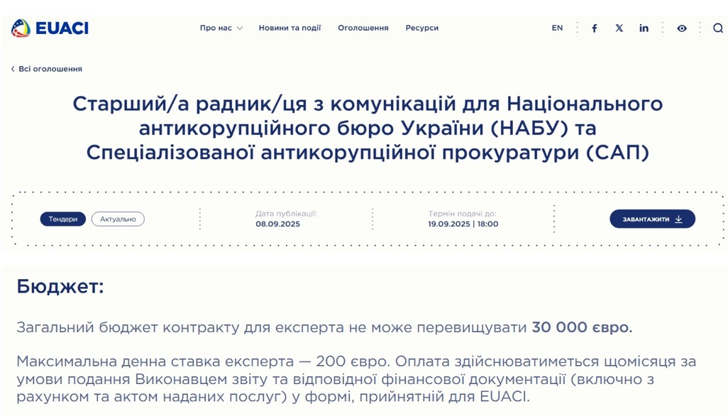 Антикорупційна ініціатива ЄС в Україні (EUACI) оголосила конкурс на старшого радника з комунікацій для Національного антикорупційного бюро (НАБУ) та Спеціалізованої антикорупційної прокуратури (САП). За пів року контракту експерту готові заплатити до 30 тис. євро (до 5 тис. євро на місяць). Про це повідомляє «Главком» з посиланням на сайт EUACI.
