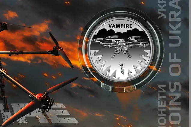 “Vampire – високоточний безпілотний літальний апарат нового покоління. Цей український гексакоптер зарекомендував себе як високоефективний засіб ураження, дистанційного мінування та гуманітарної допомоги. Від противника він отримав прізвисько “Баба Яга” – через нищівну силу ударів”, – йдеться в описі монети.